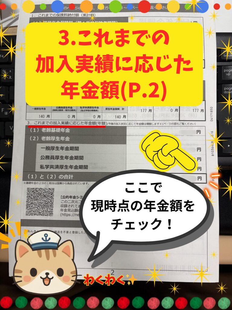 二ペヌゞ目の䞭段に「3.これたでの加入実瞟に応じた幎金額」ずいう欄がありたす🔎