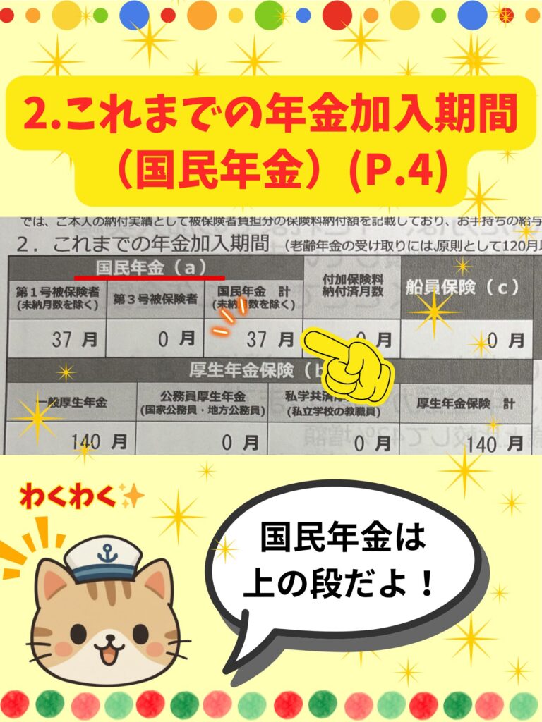 ブランク空欄の期間に囜民幎金保険料を払っおいる堎合は、「2.これたでの幎金加入期間(囜民幎金)(P.4)」に掲茉されおいるから、蚘茉挏れがないかチェック💪