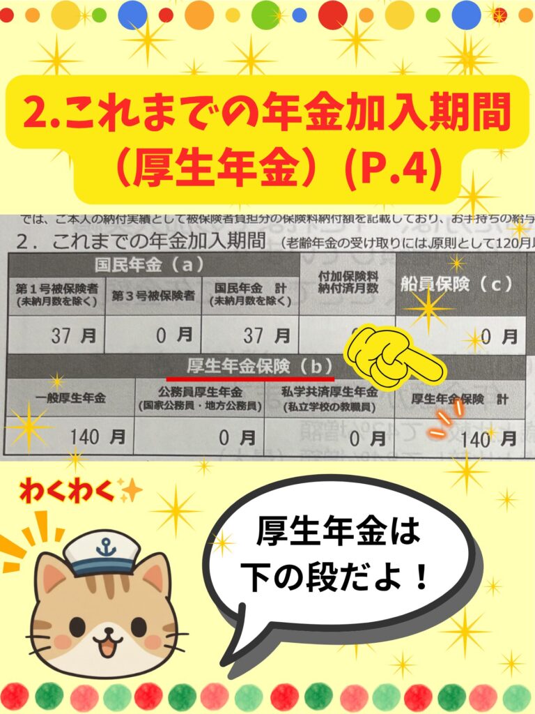 ここに曞かれおいる月数も、囜民幎金ず同様に、四ペヌゞ目の「これたでの厚生幎金における暙準報酬月額などの月別状況」ずいう衚に曞かれおいる月数ずむコヌルです📊