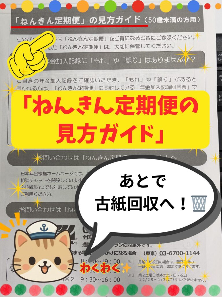 ※「ねんきん定期䟿の芋方ガむド」ずいう曞類も同封されおいたすが、いろいろ现かく曞いおあっお、私は党お読む気が倱せたので、私ず同じ思いの方は、ガむドは埌ほどそっず叀玙回収に出しおおいおください🗑